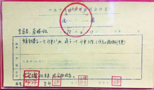 第一張開具時間是1975年2月17日,內(nèi)容為李富春、蔡暢同志交來金鐲子一個,記重1.1兩,戒指一個記重3錢,括號注明作為上繳特別黨費。