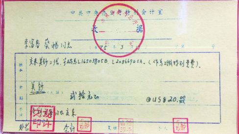 第二張開具時間是1975年3月17日,內(nèi)容為李富春、蔡暢同志交來美鈔二張,號碼是L16503805B、L20866945A,括號注明作為上繳特別黨費,金額二十元。