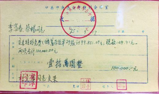 第三張開具時間是1975年3月17日,內(nèi)容為李富春、蔡暢同志交來特別黨費儲蓄存款單29張計99851.09元,現(xiàn)款148.91元,兩項合計10萬元。