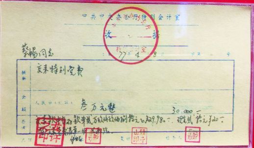 第四張開具時間是1977年4月8日,內(nèi)容為蔡暢同志交來特別黨費3萬元,交來款中有存款單29980元、現(xiàn)金20元。