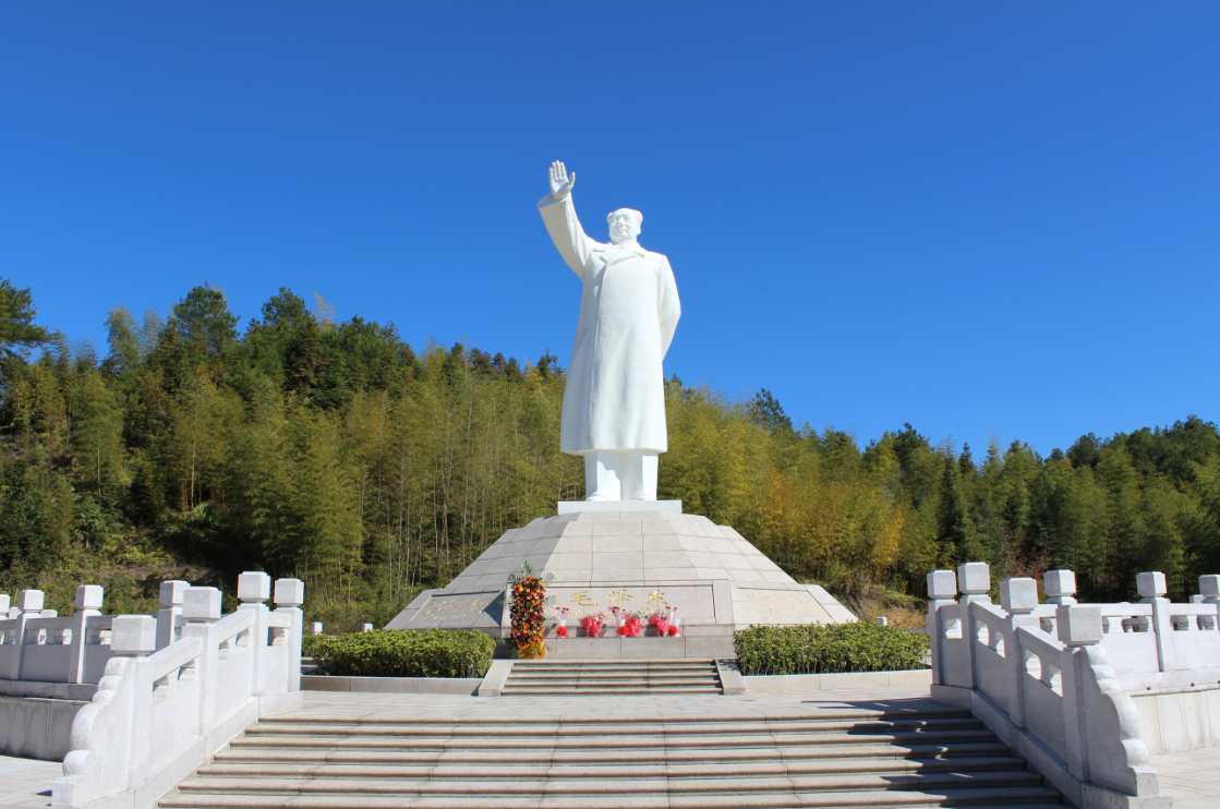 毛主席紀念園,位于會址東北側。紀念園中矗立著一尊漢白玉主席像。主席像為1969年制作,2009年安矗,高7.1米,寓意著7月1日黨的生日。基座3米,共計10.1米,與第一休息平臺有1.949米,寓意著1949年10月1日中華人民共和國成立。基座為正八邊形,寓意著紅軍的八角帽。基座周圍還鐫刻著毛主席不同時段的毛體詩詞,整個主席園設計昭示著國家興旺,人民安康。(文圖由古田旅游區提供)
