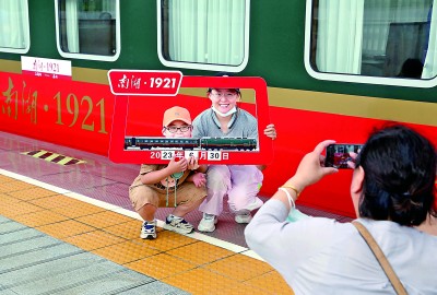旅客在“南湖·1921”紅色旅游列車旁拍照打卡。新華社發