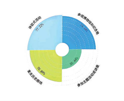 愛國主義教育入耳、入腦,更入心。此次調研中,79.75%的受訪者參與過紅色旅游,年齡主要集中在18~35歲之間。超過70%的人選擇參觀博物館和紀念地(74.68%)、重走歷史路線(70.89%)以及體驗式活動(77.22%)三種形式,90.87%的受訪者表示,參與紅色旅游的目的是學習歷史文化知識、接受紅色文化洗禮。