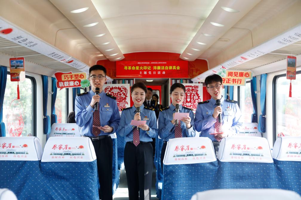 列車車廂內,鐵路職工化身文化宣傳員,講解晉綏邊區革命歷史、組織紅色經典誦讀、演奏《我和我的祖國》等紅色曲目,與旅客共唱《不忘初心》《紅旗飄飄》等歌曲,讓旅客在旅途中感悟紅色文化。