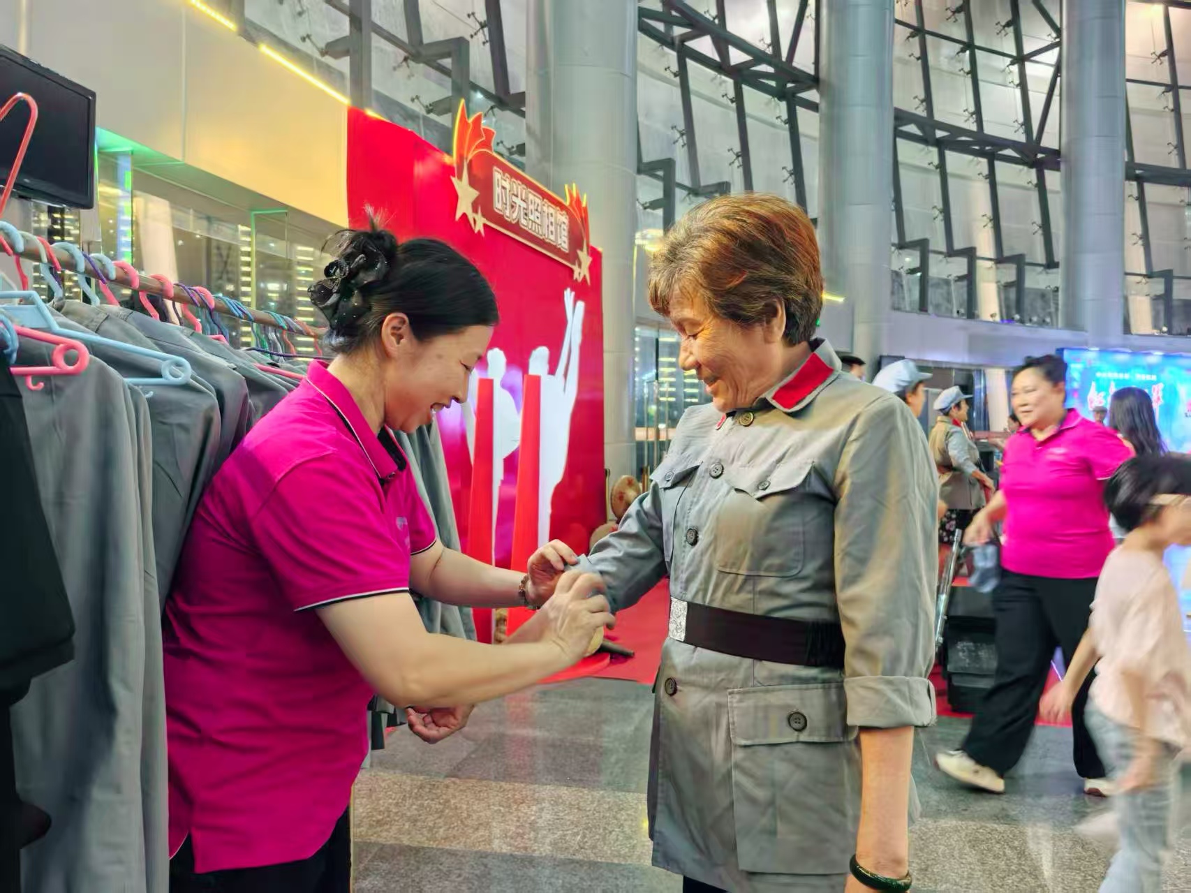 演出前,劇院大廳化身為“時光照相館”,掀起懷舊打卡熱潮。觀眾可現場換裝,手持道具,在特設場景中定格“紅色瞬間”。老人鄭重整理領章,年輕情侶并肩扛起“鋼槍”,更有小孩戴上軍帽稚氣敬禮……朋友圈瞬間被“紅色記憶”刷屏。