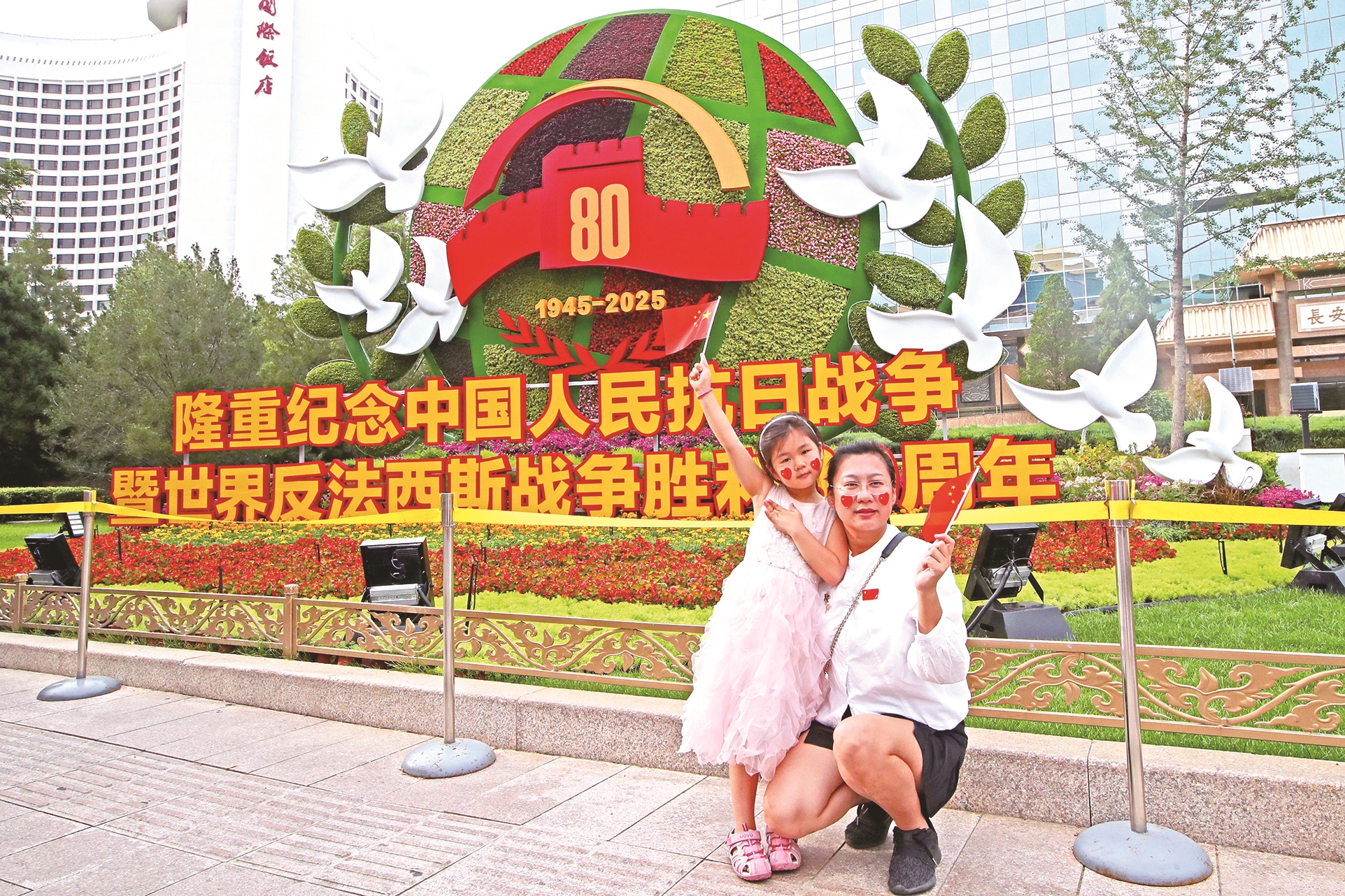 紀念中國人民抗日戰爭暨世界反法西斯戰爭勝利80周年主題花壇日前亮相北京長安街沿線,吸引了眾多市民游客駐足觀賞、拍照打卡,見證中華民族的復興之路。