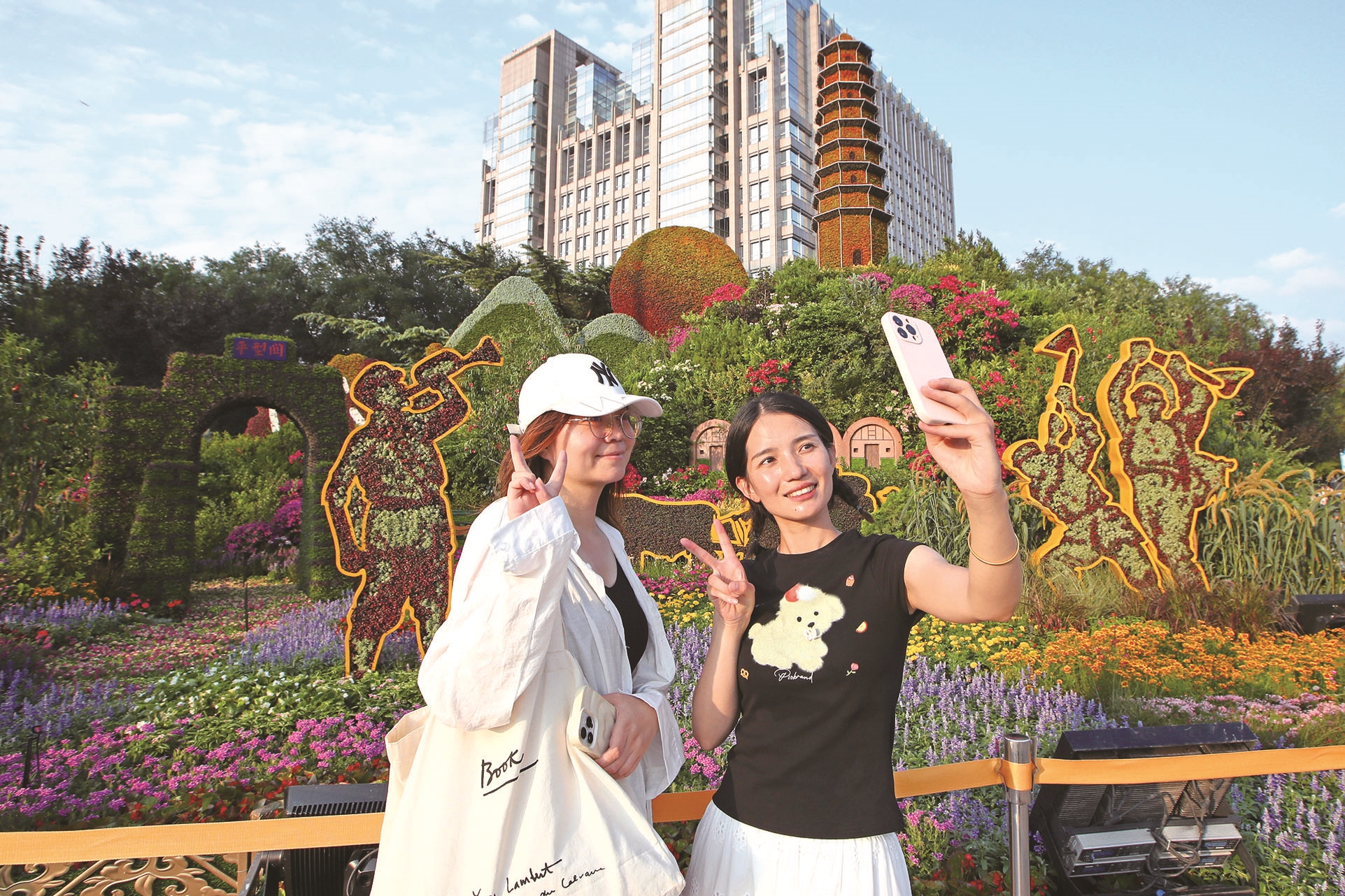 “眾志成城”花壇前,巍峨的萬里長城景象被記錄在市民游客的相機里